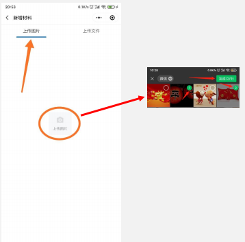 在新增材料頁面選中“上傳圖片”然后點(diǎn)擊頁面中間的相機(jī)圖標(biāo)跳轉(zhuǎn)到選擇圖片頁面,選擇完圖片后點(diǎn)擊“完成”按鈕即完成上傳材料流程。如下圖所示。