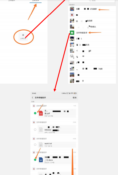 在新增材料頁面選中“上傳文件”然后點(diǎn)擊頁面中間的圖標(biāo)跳轉(zhuǎn)到微信聊天記錄列表頁面,選擇一個聊天記錄后跳轉(zhuǎn)到聊天文件列表頁面,選擇要上傳的文件后點(diǎn)擊“確定”按鈕即完成上傳材料操作。