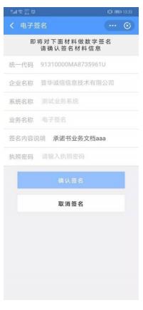 4)電子營業(yè)執(zhí)照小程序或 APP接收到簽名數(shù)據(jù)后,輸入執(zhí)照密碼,進(jìn)行電子簽名。