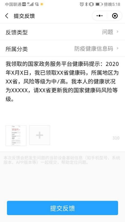 步驟三:反饋類型選擇“問題”,所屬分類選擇“防疫健康信息碼”。問題內(nèi)容參考以下模板進行填寫。上傳附件選擇“已關聯(lián)的地方健康碼”的頁面截屏。最后點擊提交反饋。國辦收到該反饋后會派發(fā)至相應省份處理。