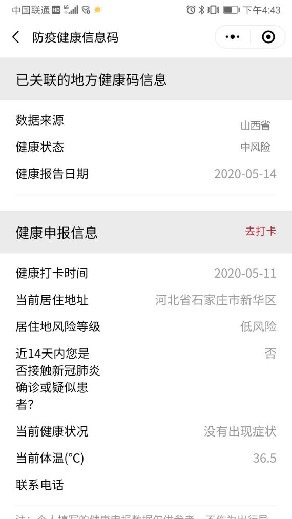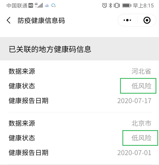 近期,部分市民在使用微信小程序“河北健康碼”、微信和支付寶小程序“國家政務服務平臺”時,選擇防疫健康信息碼服務,點擊健康碼下方“查看本人防疫健康信息詳情”選項時,提示“通過數(shù)據(jù)庫查詢,您有以下出行提示:2020年X月X日:您已領取XX省/市健康碼,所屬地區(qū)為XX省/市,風險等級為中/高”。這是由于國家政務服務平臺國家健康碼數(shù)據(jù)庫中“已關聯(lián)的地方健康碼信息”欄目中存在中/高風險:數(shù)據(jù)來源為XX省/市,健康狀態(tài)為“中/高風險”。國家健康碼中“已關聯(lián)的地方健康碼信息”如果存在中風險,河北健康碼會顯示黃色,“已關聯(lián)的地方健康碼信息”中如果存在高風險,河北健康碼會顯示紅色。(國家政服務平臺對中風險不進行提示,所以當存在中風險時,國家政務服務平臺健康碼仍為綠色)