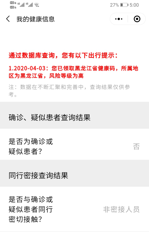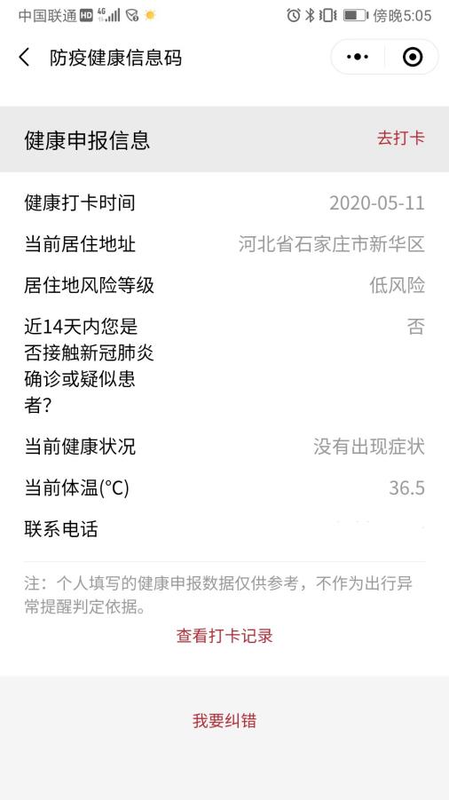 初次申領健康碼的用戶,需在完成實名認證后進行一次健康申報,點擊“去打卡”如實錄入個人健康信息,主頁面顯示健康碼的同時,如個人未存在健康風險,可在“查看個人健康信息”頁面首端看到“未見異?!保蝗鐐€人存在健康風險,則健康碼會顯示相應風險類型的顏色,并在“查看個人健康信息”頁面首端看到紅色字體的“經(jīng)過數(shù)據(jù)庫查詢,您有以下出行提示:”等內(nèi)容。