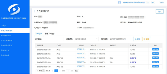 (4)點(diǎn)擊某個掃碼人員的姓名也可查看掃碼人員所有的基礎(chǔ) 信息和掃碼記錄。