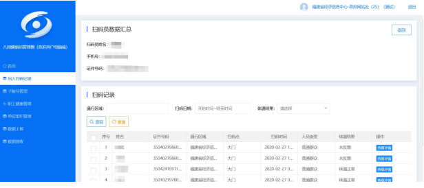 二是面向管理機(jī)構(gòu)。“八閩健康碼”同時為機(jī)關(guān)事業(yè)單位、企業(yè)和社區(qū)(村)等機(jī)構(gòu)提供掃碼申報(bào)核查和人員數(shù)據(jù)管理服務(wù),可應(yīng)用于機(jī)關(guān)辦公、企業(yè)復(fù)工、小區(qū)(村)出入、交通通行不同場景,通過掃碼核查獲取用戶基本信息、健康防控信息、當(dāng)前位置信息并記錄上報(bào),實(shí)現(xiàn)快速通行;同時,可在管理側(cè)電腦端的進(jìn)行人員數(shù)據(jù)管理和可視化數(shù)據(jù)分析展示,以及自動制表并自動關(guān)聯(lián)或在線推送上級管理部門。管理人員無需配備專用掃碼槍,使用“法人用戶”登錄閩政通 APP,選擇“出入掃碼服務(wù)”即可核查獲取用戶疫情防控相關(guān)的健康信息及分區(qū)分級信息快速驗(yàn)證通行。
