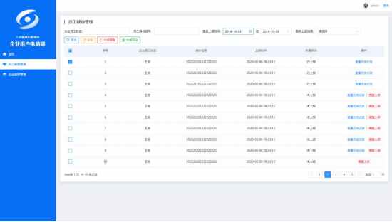 (1)員工健康管理表,可輸入企業(yè)員工姓名、員工身份證號 或選擇最新上報(bào)時間、最新上報(bào)結(jié)果,點(diǎn)擊【查詢】按鈕,數(shù)據(jù) 表會顯示對應(yīng)的查詢對象。