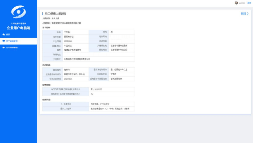 企業(yè)員工管理主要是記錄企業(yè)的基本信息和企業(yè)員工信息。其中,企業(yè)基本信息包括企業(yè)名稱、企業(yè)統(tǒng)一社會信用代碼、企 業(yè)法人姓名、法人電話號碼;企業(yè)員工信息主要是企業(yè)導(dǎo)入的員 工信息。