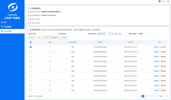 (1)企業(yè)員工信息表,可輸入企業(yè)員工姓名、員工身份證號 或選擇最新上報(bào)時間、最新上報(bào)結(jié)果,點(diǎn)擊【查詢】按鈕,數(shù)據(jù) 表會顯示對應(yīng)的查詢對象。