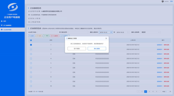 (4)勾選多名需要刪除的員工。點(diǎn)擊【批量刪除】或點(diǎn)擊單 個員工【刪除信息】,頁面彈出提示框。
