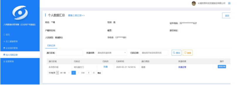 3.點(diǎn)擊某個通行人員的姓名還可看到,該人員所有的基礎(chǔ) 信息、通行記錄和健康上報(bào)記錄。