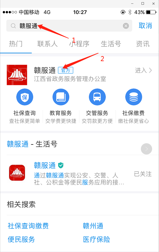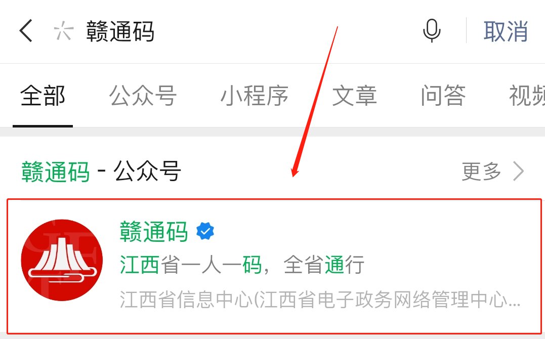 1.使用微信搜一搜搜索“贛通碼”,關(guān)注贛通碼公眾號;