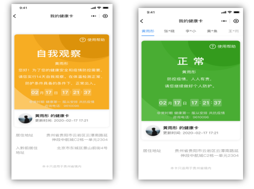 按照“醫(yī)院隔離、集中隔離、居家隔離、自我觀察、正常通行”五種管控措施,“貴州健康碼”分別用“紫、紅、橙、黃、綠”五種顏色對應(yīng),掃碼時不同人員會顯示與其對應(yīng)的顏色。個人健康卡顯示“黃色”和“綠色”人員,一次登錄全省亮碼通行,在體溫檢測正常并按要求落實防護(hù)措施后,可以正常出入小區(qū)、商場、園區(qū)、公共服務(wù)機構(gòu)等重點場所,實現(xiàn)省內(nèi)人員流動暢通。