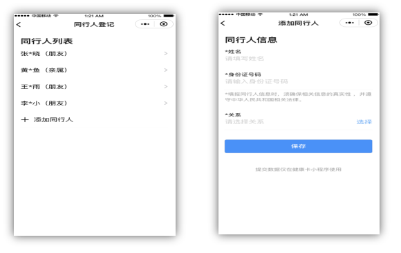 第一步:在小程序首頁點擊[信息登記]功能;第二步:[個人信息登記]頁面下點擊[同行人登記]功能;第三步:點擊[添加同行人]具體輸入同行人姓名、身份證號、關(guān)系信息,點擊[保存]提交同行人信息即可。