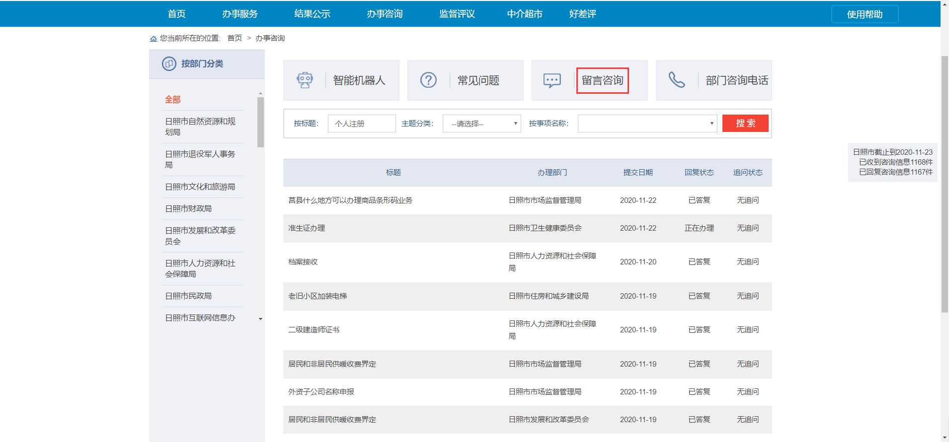 2.留言咨詢:在“辦事咨詢”模塊,點擊“留言咨詢”,根據(jù)提示信息填寫姓名、電話號碼、電子郵箱,選擇部門和事項,填寫標(biāo)題、咨詢內(nèi)容、頁面驗證碼,然后提交,等待業(yè)務(wù)人員回復(fù)(一般會在2個工作日內(nèi)收到回復(fù))。