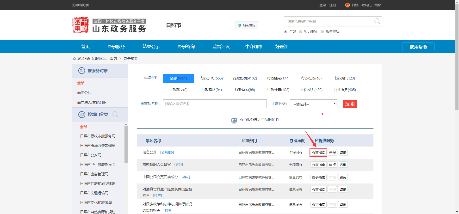 1.找到需要辦理的事項,在右側(cè)點擊“辦事指南”。