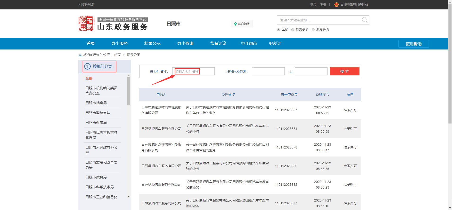 2.在“結(jié)果公示”頁面,在左側(cè)“按部門分類”中查找該事項所在的部門,在辦件名稱框中直接輸入辦件名稱進行查找。