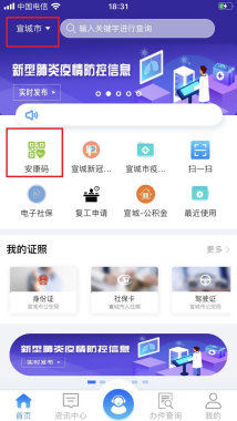 第二步:同意“自動定位”彈窗,或在主頁面左上角手動選擇“宣城市”;然后點擊“安康碼”菜單。