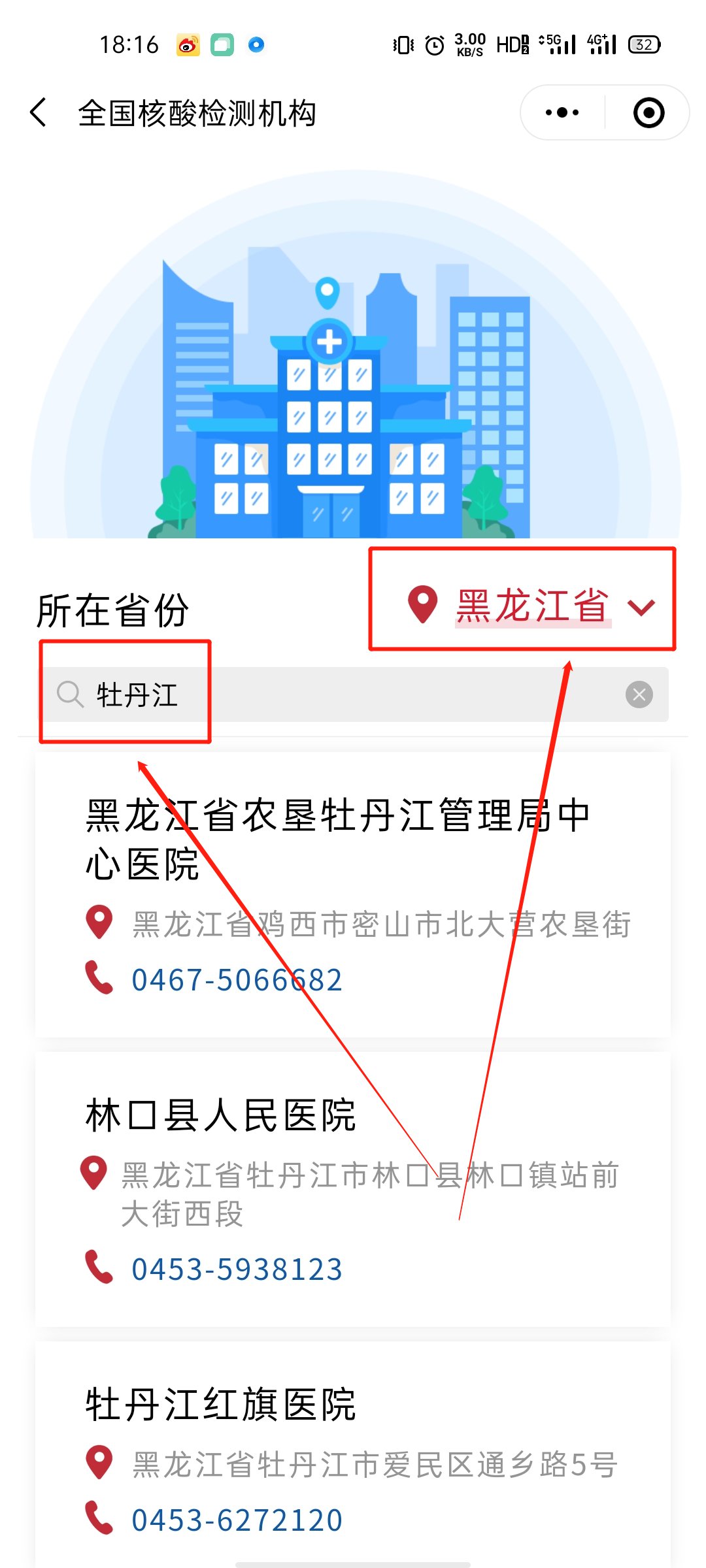 第三步,將省份修改為“黑龍江省”,并在搜索框中輸入“牡丹江”;接著即可查詢到牡丹江核酸檢測(cè)醫(yī)院的情況;可以查詢到地址,電話等信息;(如下圖所示)