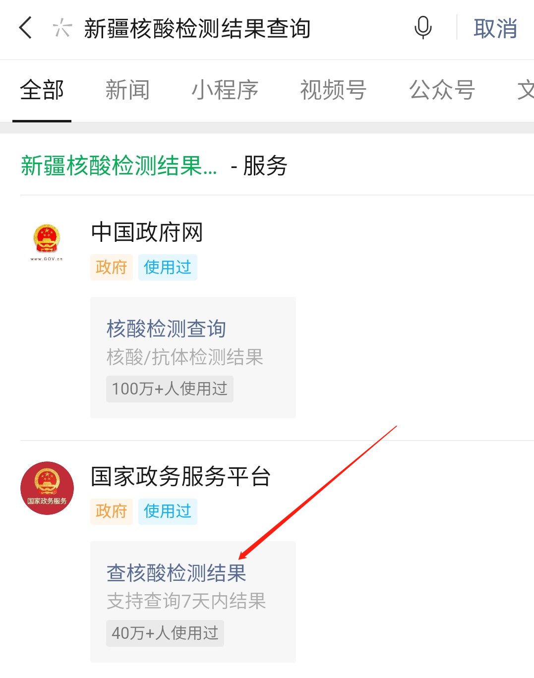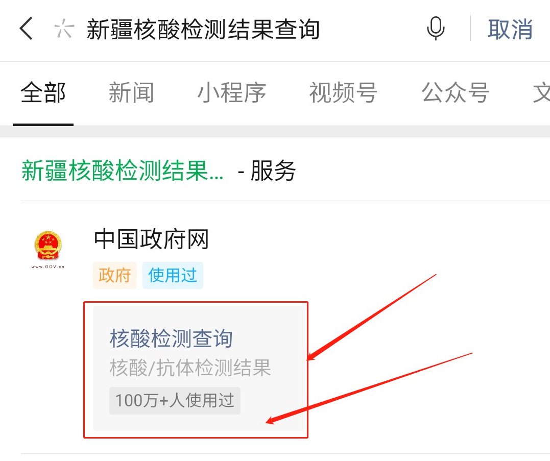 使用微信搜索“新疆核酸檢測結(jié)果查詢”,點擊進(jìn)入中國政務(wù)網(wǎng)下面的“核酸檢測查詢”,或直接點擊識別下方二維碼進(jìn)入小程序;