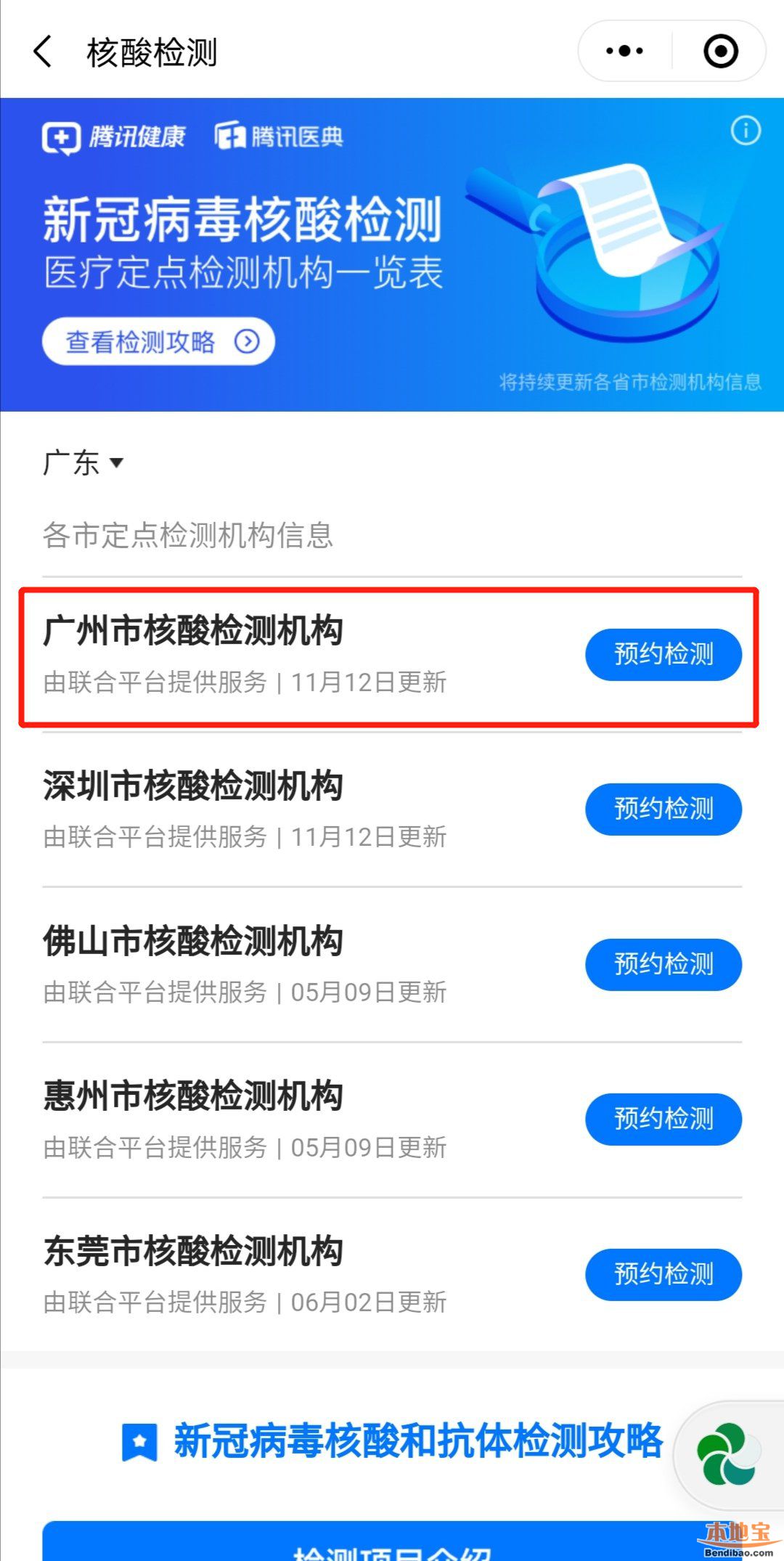 第三步:選擇“廣州市核酸檢測(cè)機(jī)構(gòu)”,點(diǎn)擊“預(yù)約檢測(cè)”;