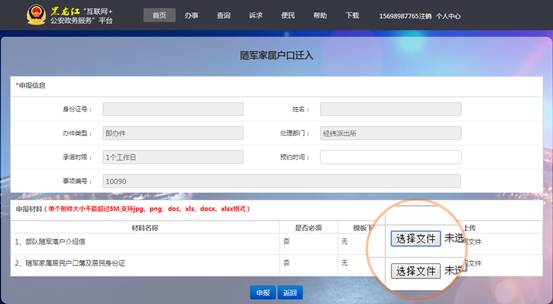 第四步 填寫信息,若要求上傳申報(bào)材料,點(diǎn)擊申報(bào)材料框內(nèi)的“選擇文件”