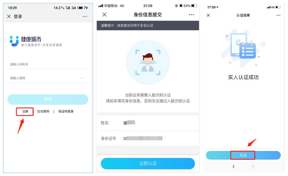 3、點擊注冊申領(lǐng)電子健康卡。輸入手機號并驗證,填寫就診人的身份信息,點擊【立即認(rèn)證】,進入人臉識別認(rèn)證環(huán)節(jié)后,【去申領(lǐng)】電子健康卡。(如已有健康卡,則略過此步驟)