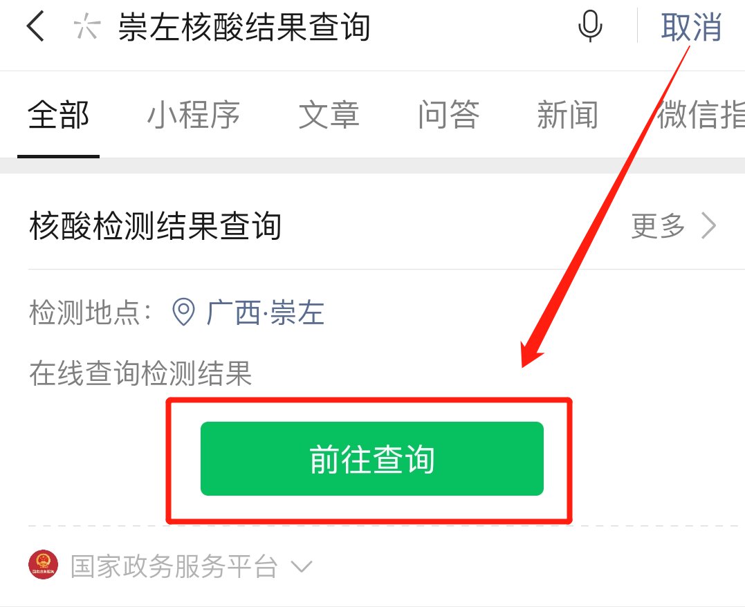 1.使用微信搜索“崇左核酸結(jié)果查詢”,隨后點(diǎn)擊核酸檢測(cè)結(jié)果查詢服務(wù)中的“前往查詢”(如下圖所示);