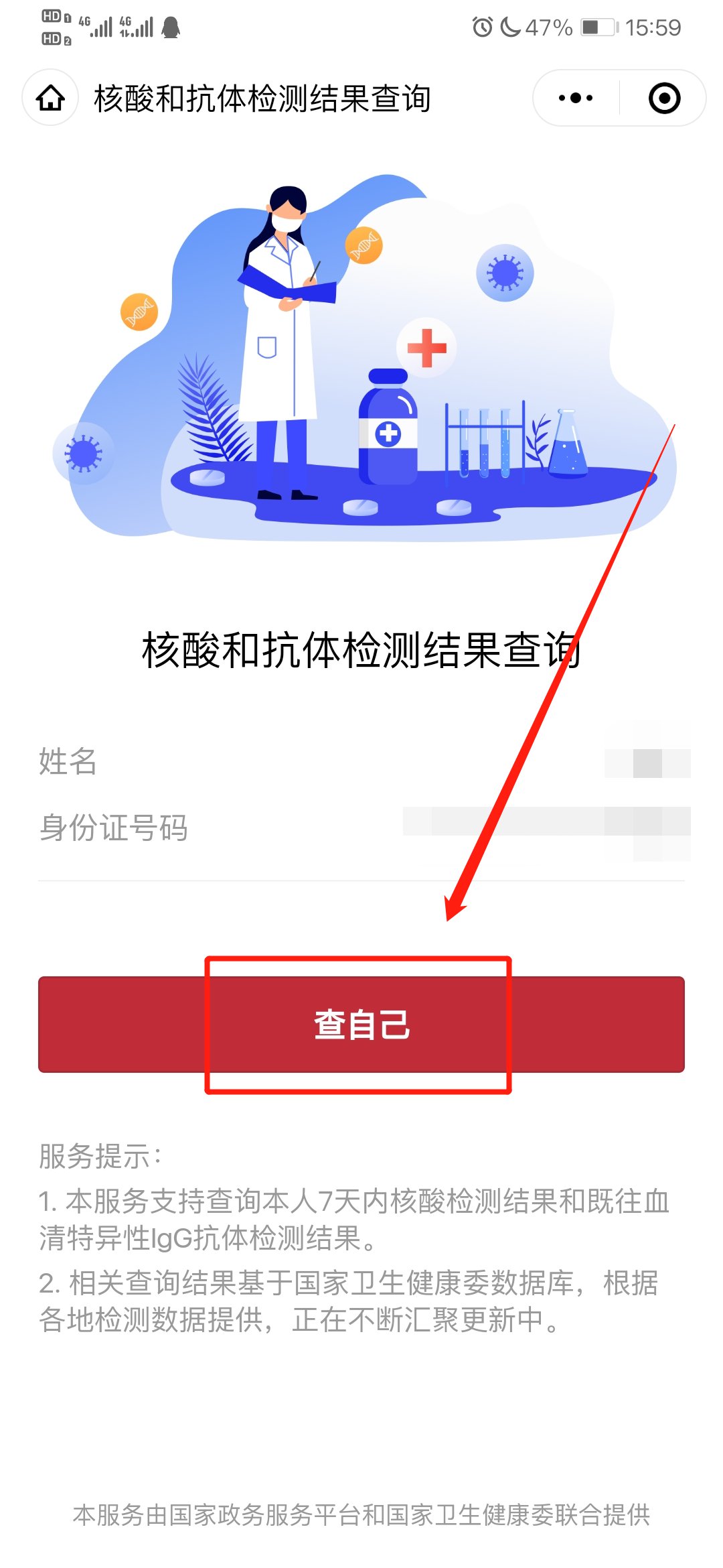 3.在查詢頁面輸入個(gè)人姓名和身份證號(hào)碼后,點(diǎn)擊下方的“查自己”即可查詢到個(gè)人相關(guān)的核酸檢測(cè)結(jié)果,如下圖所示。