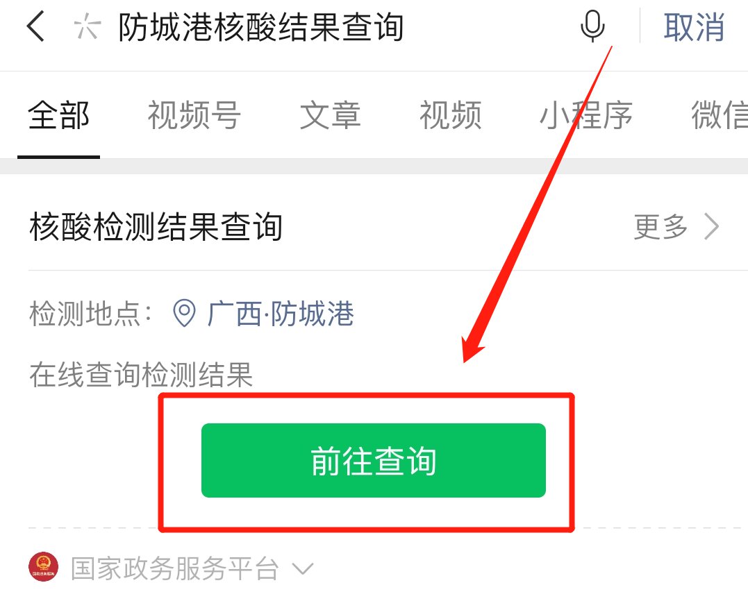 1.使用微信搜索“防城港核酸結(jié)果查詢”,隨后點擊核酸檢測結(jié)果查詢服務(wù)中的“前往查詢”(如下圖所示);