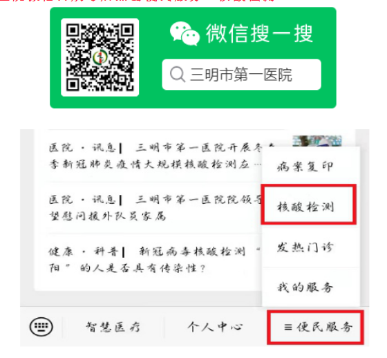 1、關(guān)注三明第一醫(yī)院微信公眾號后點擊便民服務(wù)→核酸檢測