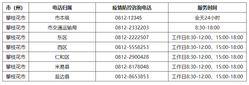 攀枝花市各區(qū)(縣、市)新冠疫情防控指揮部咨詢電話