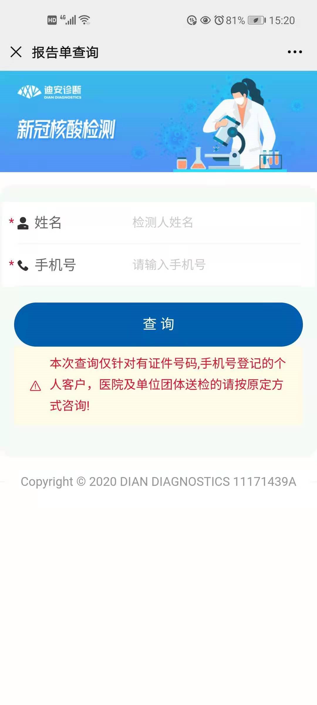 4.報告時限:公眾原則上為2個工作日出報告,可通過關(guān)注“迪安助手”查詢檢測結(jié)果,并自行下載打印檢驗報告。