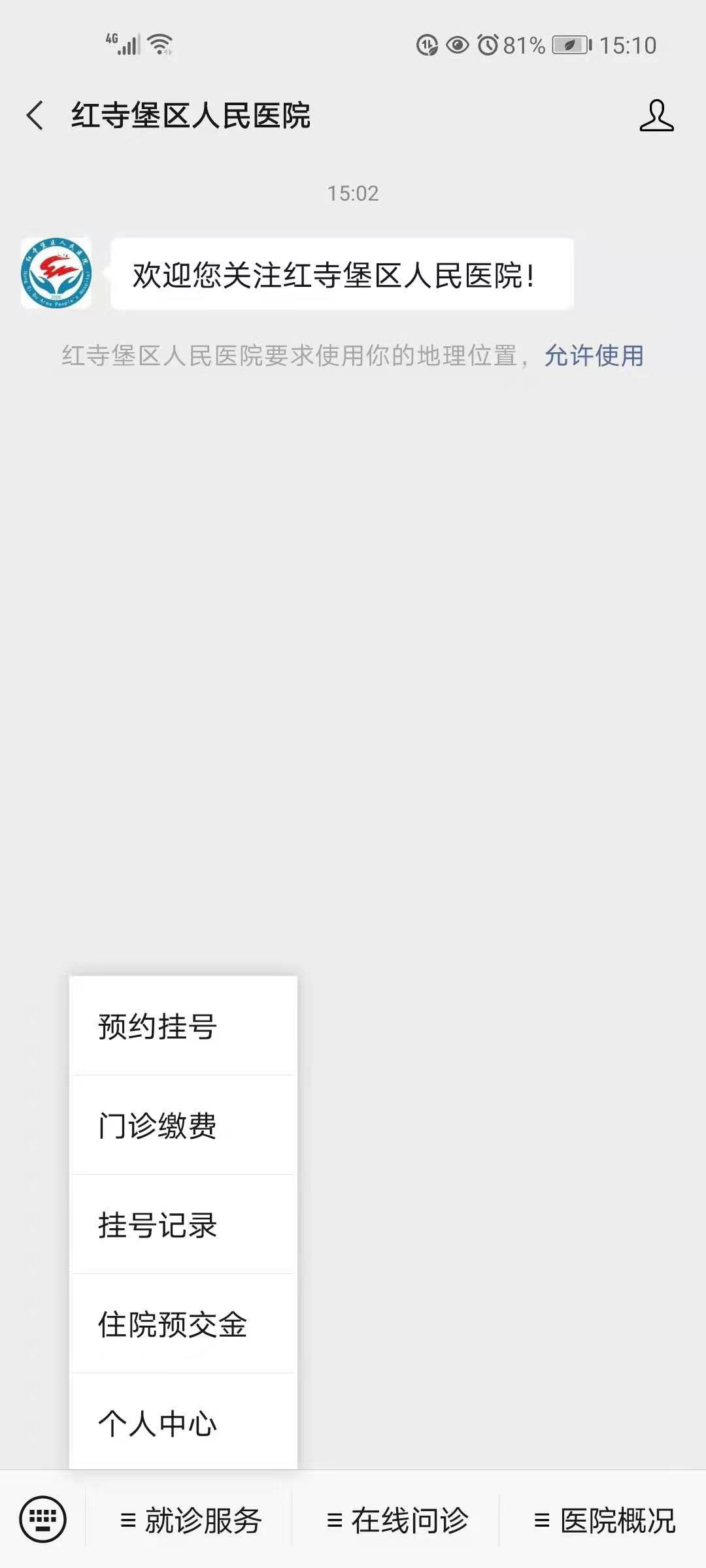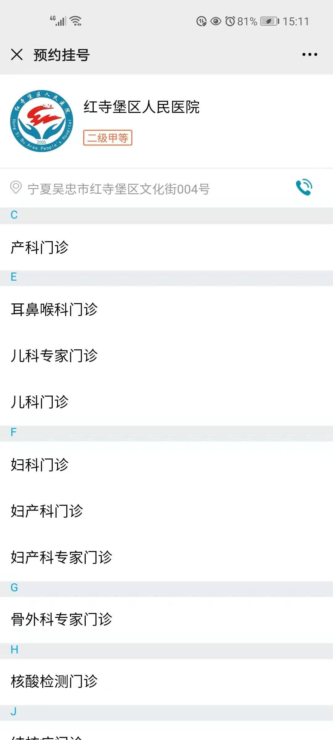2.提交后將自動跳轉到“紅寺堡區(qū)人民醫(yī)院”微信公眾號,長按識別關注公眾號,關注后點擊菜單欄就診服務----->預約掛號----->核酸檢測門診。