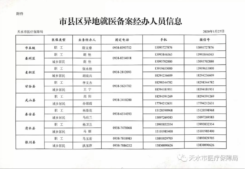 天水市醫(yī)療保障局市、縣區(qū)異地就醫(yī)備案經(jīng)辦人員信息