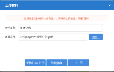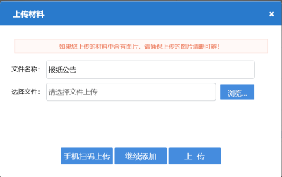 8. 點(diǎn)擊報(bào)紙公告右側(cè)的【上傳】,選擇上傳報(bào)紙公告文件。