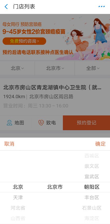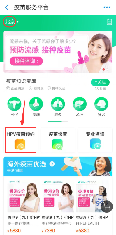 第2步,定位北京,點(diǎn)擊“HPV疫苗預(yù)約”↓