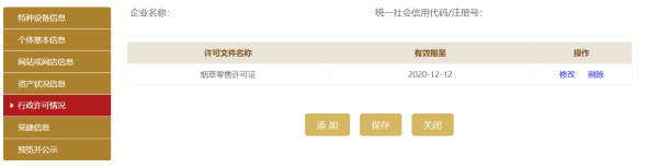 點(diǎn)擊添加,填寫行政許可情況信息。點(diǎn)擊保存,進(jìn)入行政許可情況信息基本頁(yè)面,再點(diǎn)擊保存。