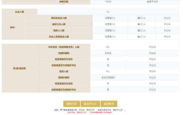 第十二步:點(diǎn)擊預(yù)覽打印,注意:請(qǐng)仔細(xì)核對(duì)填報(bào)信息,需對(duì)公示信息的真實(shí)性、合法性負(fù)責(zé)。點(diǎn)擊打印即可打印,無(wú)需打印點(diǎn)擊關(guān)閉。