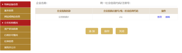 點擊添加,填寫分支機構(gòu)情況信息。點擊保存進入分支機構(gòu)情況信息頁面,再點擊保存。