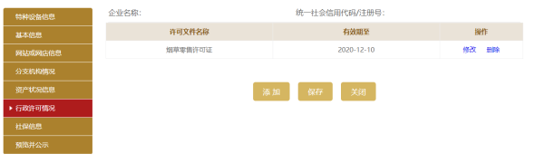 點擊添加,填寫行政許可情況信息。點擊保存,進入行政許可情況信息基本頁面,再點擊保存。