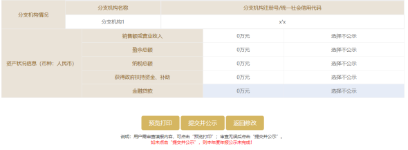 第十二步:進入預(yù)覽頁面。說明:用戶需審查填報內(nèi)容,可點擊“預(yù)覽打印”;審核無誤后點擊“提交并公示”。如未點擊“提交并公示”,則本年度年度報告公示未完成。