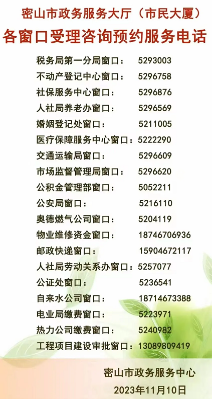 1、密山市市民大廈各窗口咨詢預(yù)約電話