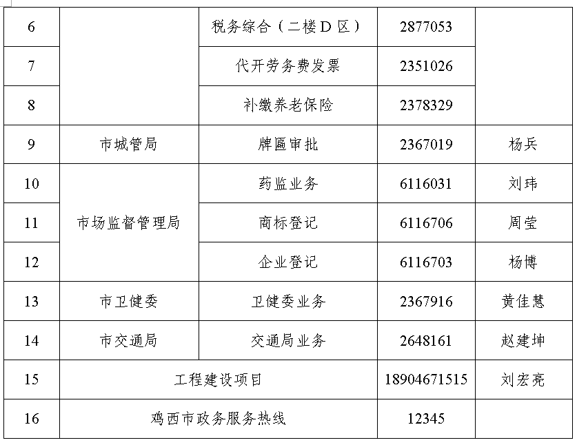 為更好的服務(wù)廣大市民朋友,雞西市政務(wù)服務(wù)中心現(xiàn)將各部門咨詢電話公布如下,咨詢時(shí)間為工作日上午8:00-11:30,下午13:00-16:30。