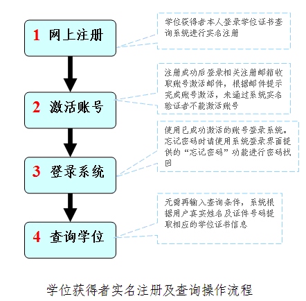 學(xué)位獲得者本人需閱讀并同意《學(xué)位證書查詢系統(tǒng)學(xué)位獲得者實(shí)名注冊條款》,并在使用過程中遵守本協(xié)議所述之條款,自行進(jìn)行實(shí)名注冊,所注冊的個(gè)人信息必須真實(shí)、準(zhǔn)確。注冊成功后系統(tǒng)將進(jìn)行驗(yàn)證,并將驗(yàn)證結(jié)果發(fā)送至您注冊的電子郵箱,請登錄個(gè)人郵箱完成賬號(hào)激活操作,注冊后24小時(shí)不激活賬號(hào)者系統(tǒng)將自動(dòng)清除注冊的信息;注冊信息驗(yàn)證未通過的,請根據(jù)郵件提示進(jìn)行咨詢,系統(tǒng)將于注冊后2小時(shí)自動(dòng)清除驗(yàn)證未通過的注冊信息。