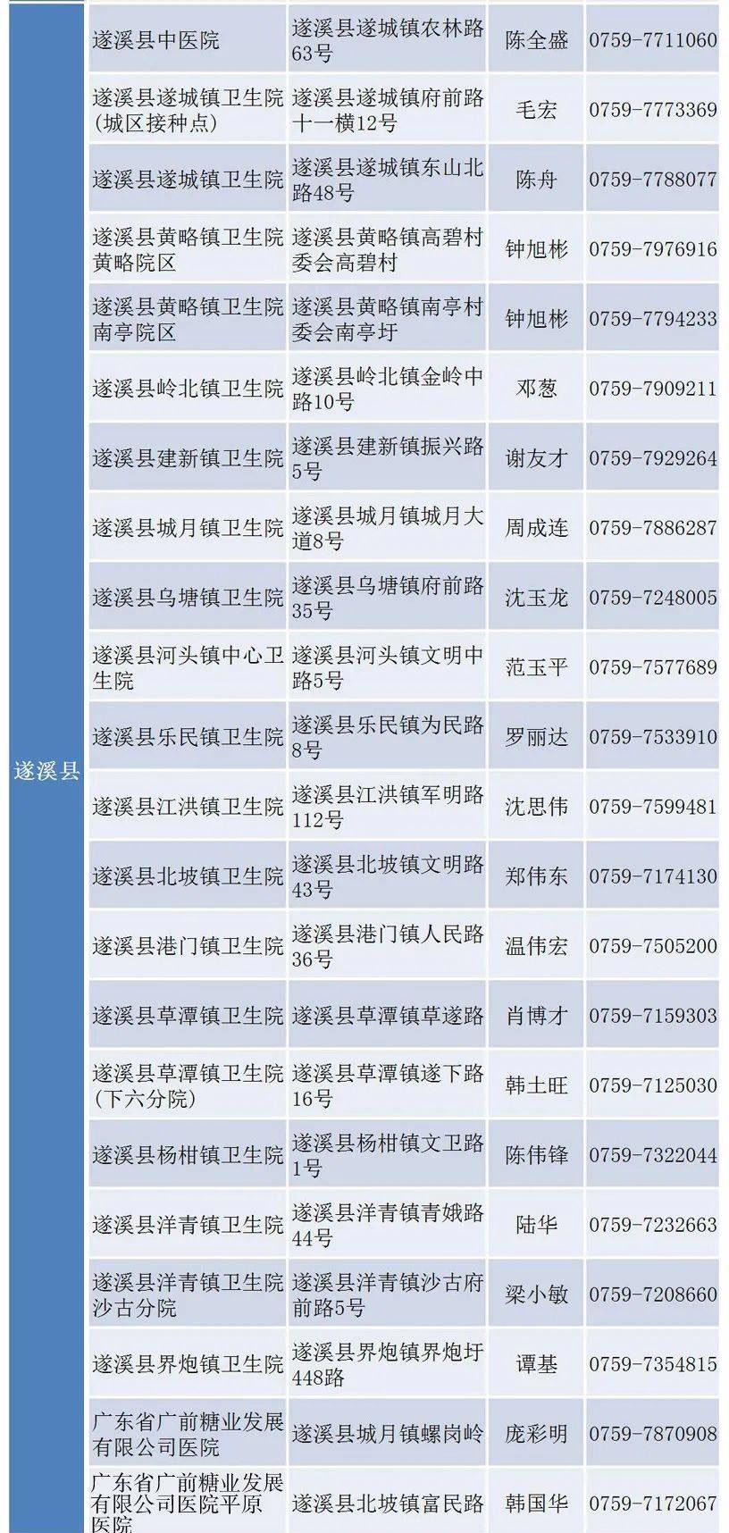 按照國家、省、市相關(guān)工作要求,遂溪縣已陸續(xù)開展對重點人群和其他人群新冠病毒疫苗接種工作。近日,遂溪縣衛(wèi)健委公布我縣新冠病毒疫苗預(yù)防接種點。目前,遂溪縣共有22家機(jī)構(gòu)可供市民預(yù)約接種新冠病毒疫苗。詳細(xì)單位名單、地址、接種時間和預(yù)約電話等信息看這里↓↓↓
