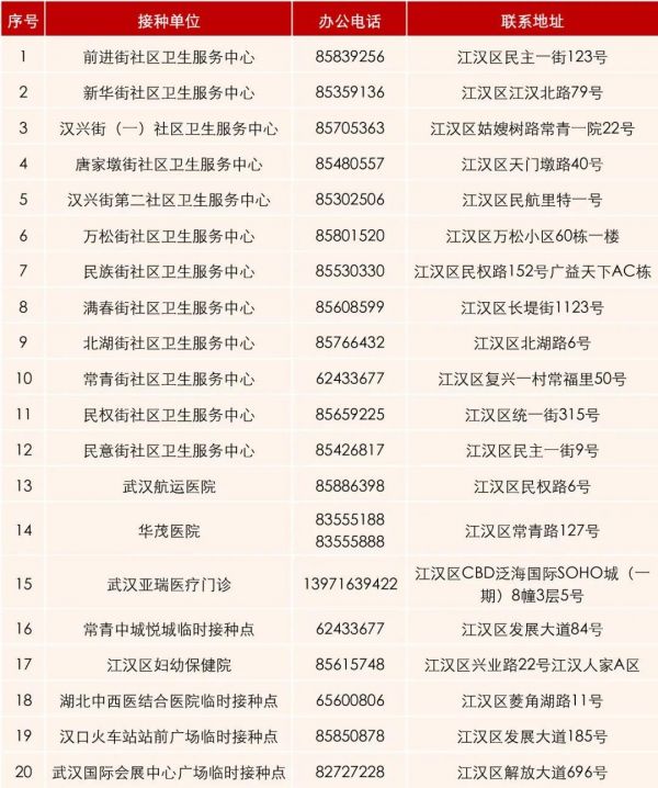 武漢市江漢區(qū)新冠病毒疫苗接種點匯總