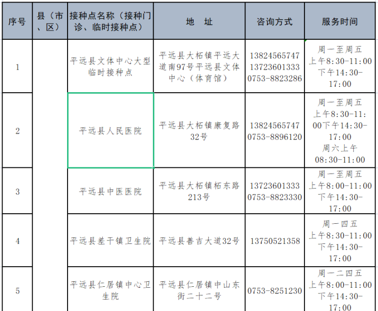 梅州市平遠縣新冠病毒疫苗接種點信息