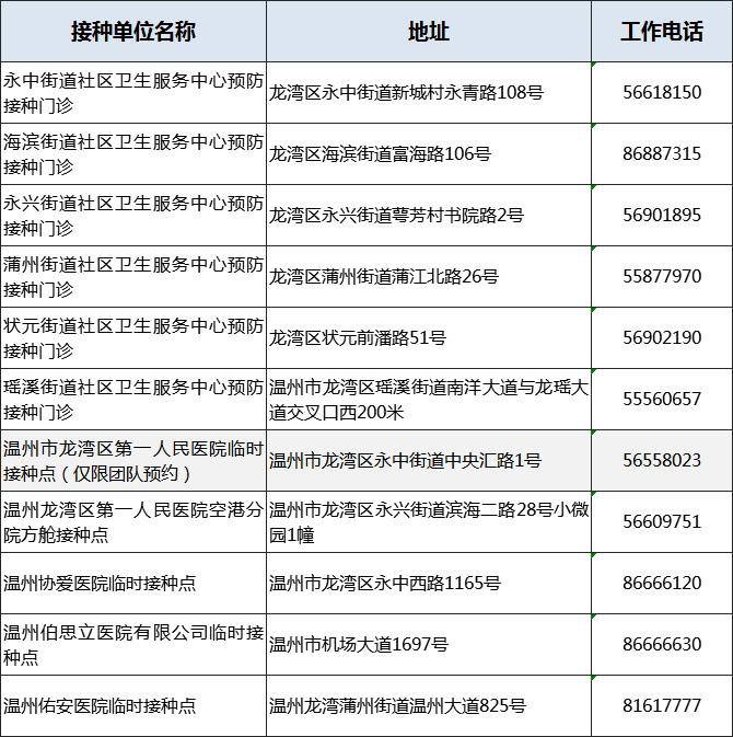 接種地址:溫州市龍灣區(qū)瑤溪街道蘇川村蘇川路36號(hào) 龍灣區(qū)瑤溪街道白樓下村富康路1號(hào)