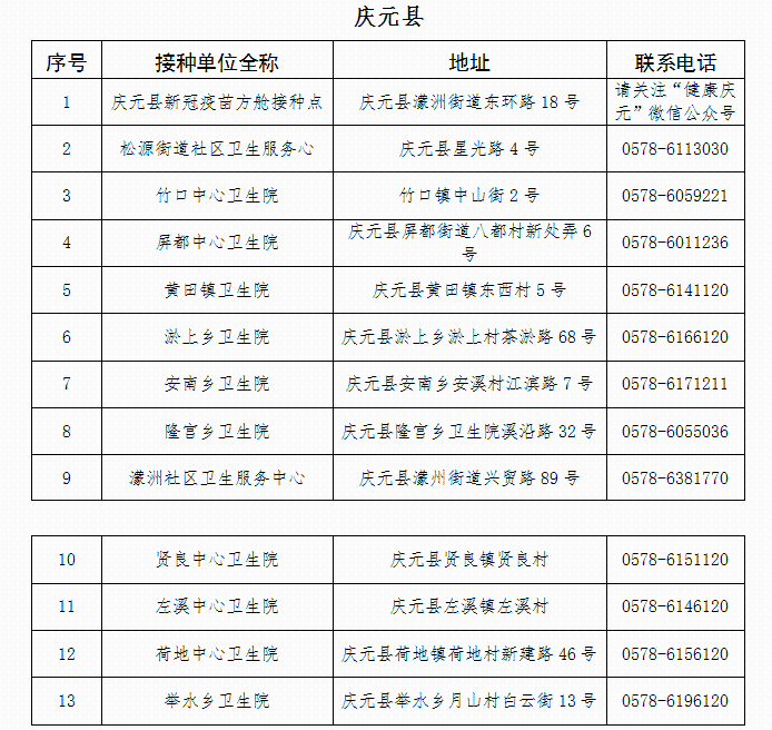 即日起,麗水市慶元縣轄區(qū)內18歲以上居民(含60歲以上)不論戶籍,身體狀況符合接種要求的均需免費接種新冠病毒疫苗,請您與所在單位或社區(qū)聯(lián)系疫苗接種相關事宜。零散居民、流動人口也可攜帶身份證,就近自行前往接種點接種,接種點會根據(jù)疫苗供應情況、日接種能力、排隊順序等發(fā)放接種序號。慶元縣居民預約接種新冠病毒疫苗單位名單、地址、接種時間和預約電話等相關信息看這里↓↓↓
