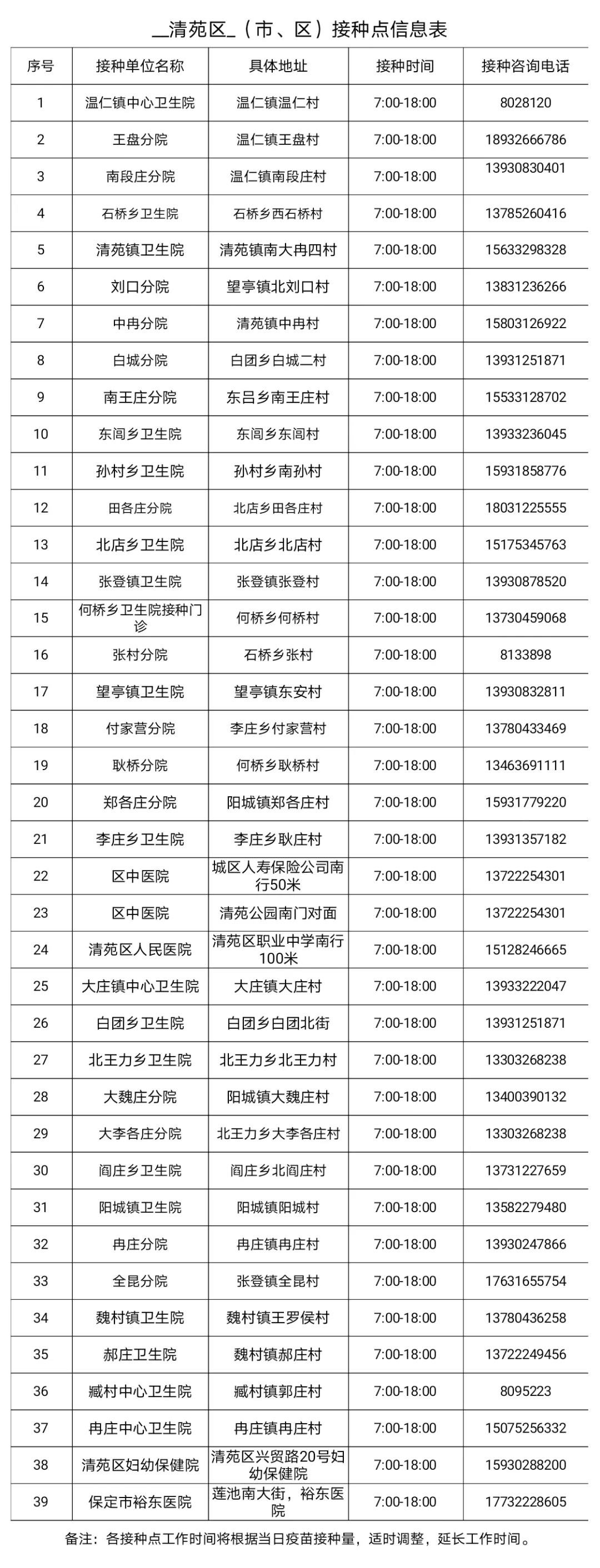 即日起,保定市清苑區(qū)轄區(qū)內(nèi)18歲以上居民(含60歲以上)不論戶籍,身體狀況符合接種要求的均需免費(fèi)接種新冠病毒疫苗,請(qǐng)您與所在單位或社區(qū)聯(lián)系疫苗接種相關(guān)事宜。零散居民、流動(dòng)人口也可攜帶身份證,就近自行前往接種點(diǎn)接種,接種點(diǎn)會(huì)根據(jù)疫苗供應(yīng)情況、日接種能力、排隊(duì)順序等發(fā)放接種序號(hào)。清苑區(qū)居民預(yù)約接種新冠病毒疫苗單位名單、地址、接種時(shí)間和預(yù)約電話等相關(guān)信息看這里↓↓↓