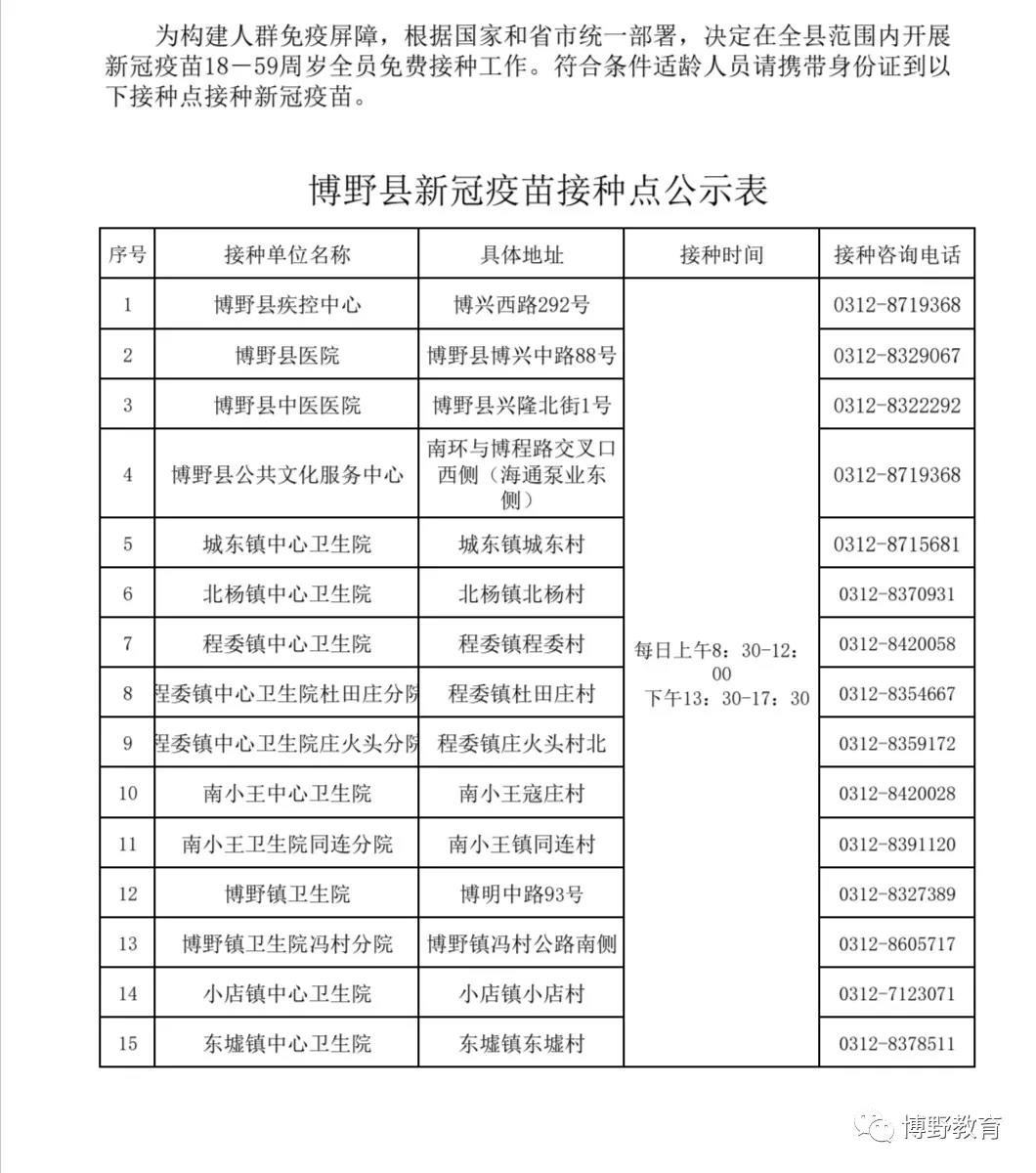 即日起,保定市博野縣轄區(qū)內(nèi)18歲以上居民(含60歲以上)不論戶籍,身體狀況符合接種要求的均需免費(fèi)接種新冠病毒疫苗,請(qǐng)您與所在單位或社區(qū)聯(lián)系疫苗接種相關(guān)事宜。零散居民、流動(dòng)人口也可攜帶身份證,就近自行前往接種點(diǎn)接種,接種點(diǎn)會(huì)根據(jù)疫苗供應(yīng)情況、日接種能力、排隊(duì)順序等發(fā)放接種序號(hào)。博野縣居民預(yù)約接種新冠病毒疫苗單位名單、地址、接種時(shí)間和預(yù)約電話等相關(guān)信息看這里↓↓↓